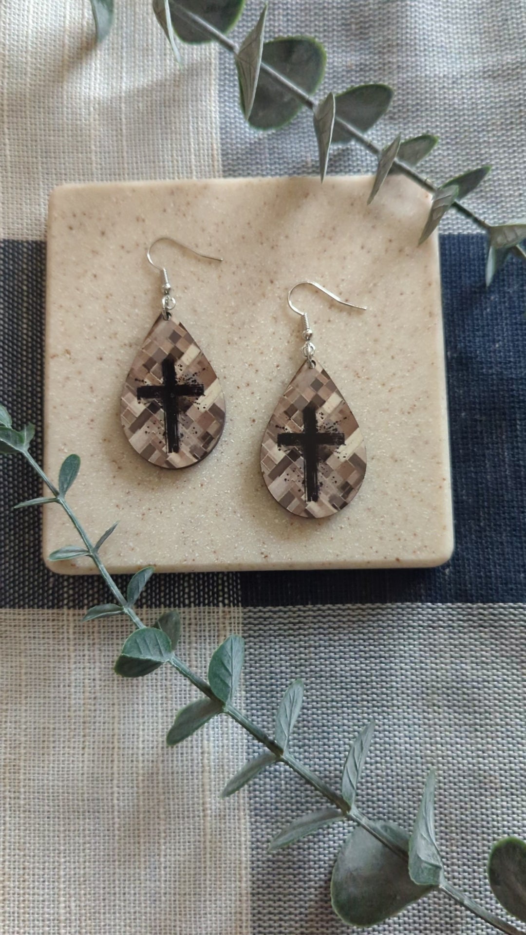 Checkered | Wooden Background | Paint Splatter | Cross | Neutral | Faith | Christian | Teardrop Earrings