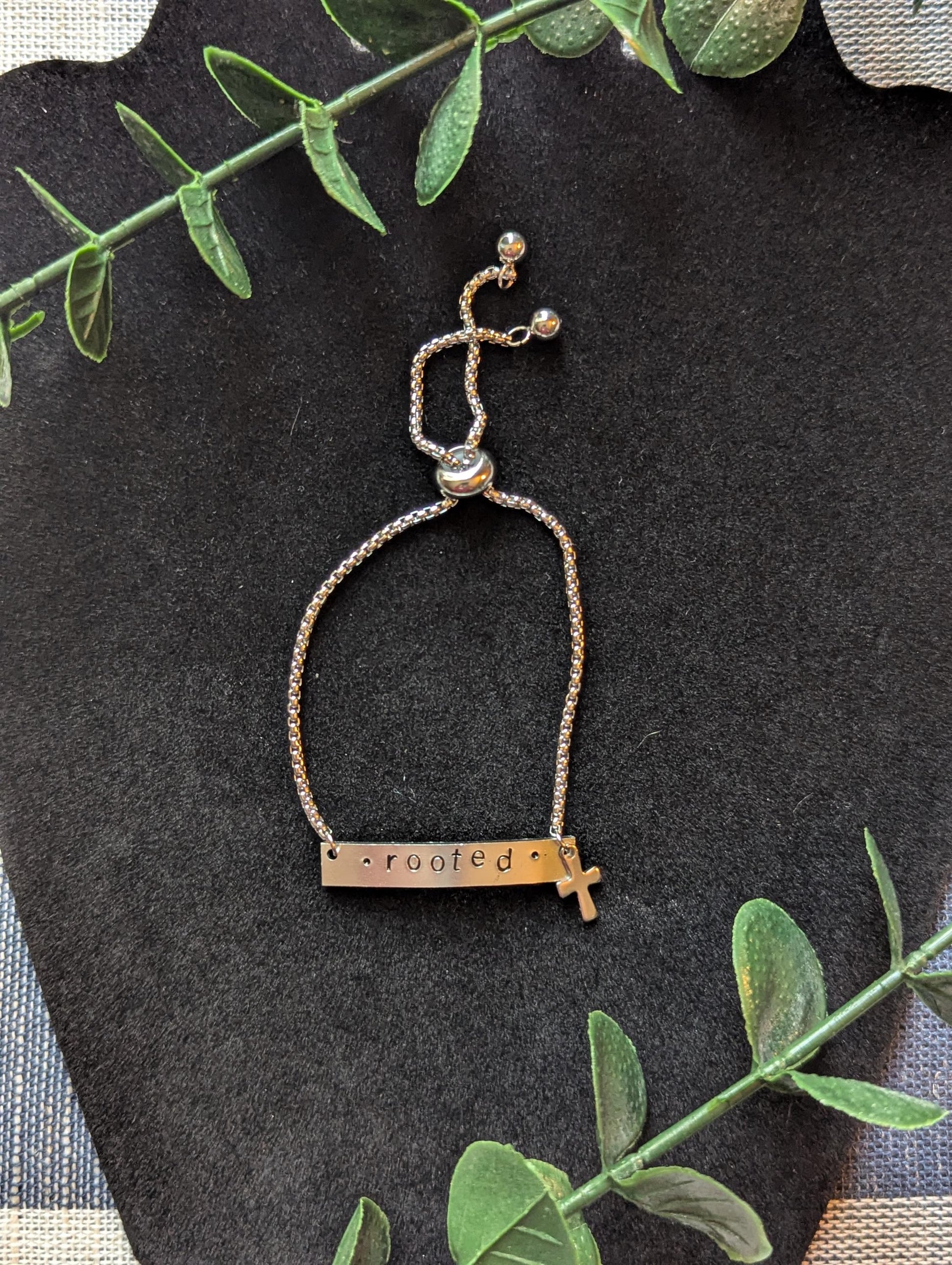 These bracelets consist of a stainless steel, bolo style, adjustable slider bracelet chain connected to a hand stamped, aluminum bar with your choice of Yahweh, Manna, Rooted, It is Well, Chosen, Abide, Surrender, Agape, WWJD or I Am wording, and a stainless-steel cross charm to complete.