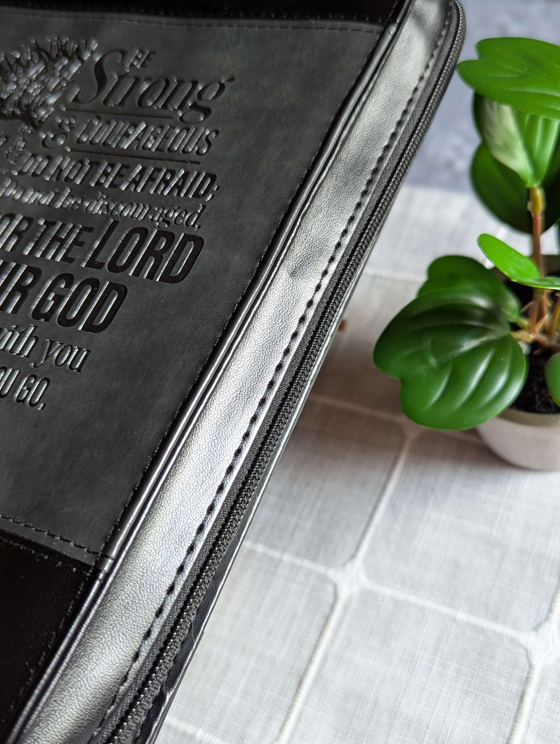 Live your Faith out loud with this beautifully crafted Be Strong & Courageous Bible cover featuring the powerful verse from Joshua 1:9.