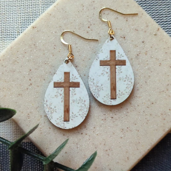 Leafy | Floral Background | Wooden Cross | Neutral | Faith | Christian | Teardrop Earrings | Gold-Filled Hooks
