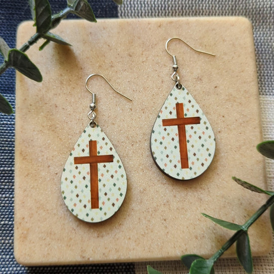 Multi Color Diamond Shaped Dots | Wooden Cross | Neutral | Faith | Christian | Teardrop Earrings