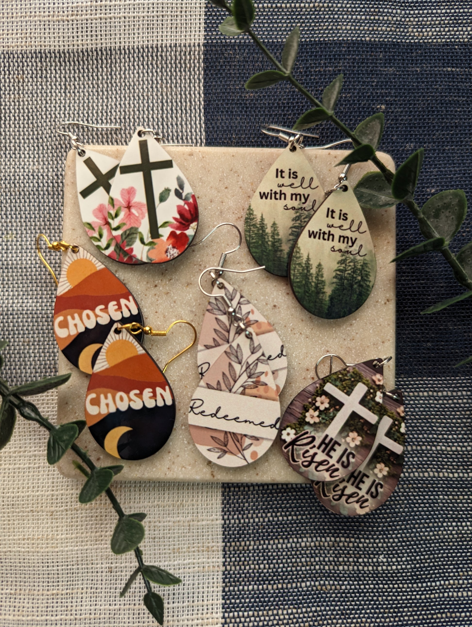 Celebrate your faith in style with these beautifully designed "Redeemed" teardrop earrings. Crafted from lightweight MDF and sublimated with soft, earthy tones and delicate botanical elements, these earrings make a bold yet elegant statement of hope and identity.